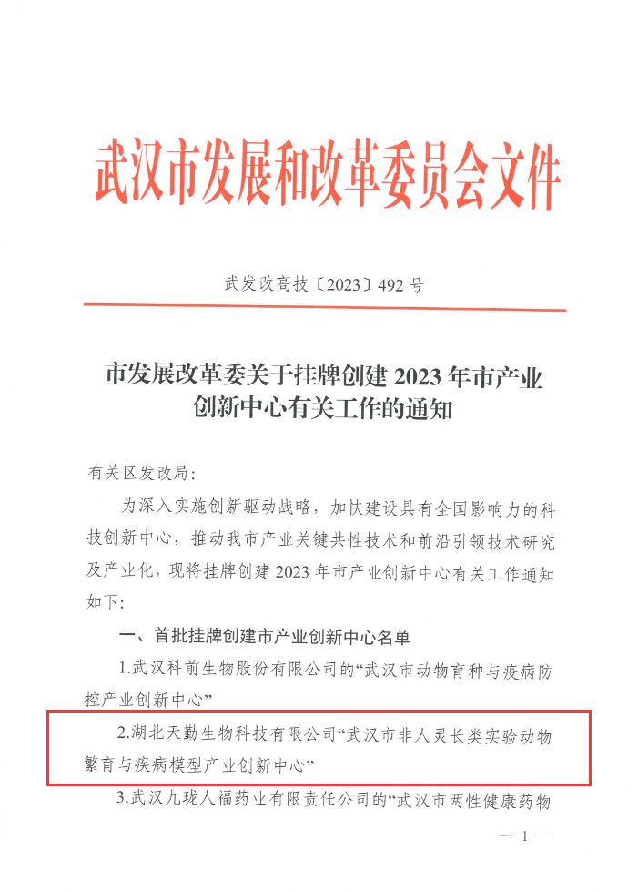天勤生物“武漢市非人靈長類實(shí)驗(yàn)動(dòng)物繁育與疾病模型產(chǎn)業(yè)創(chuàng)新中心”成功獲批